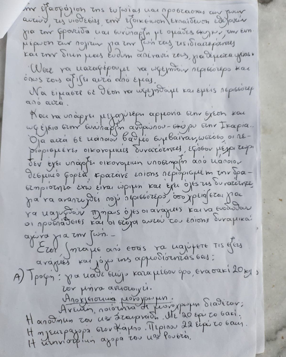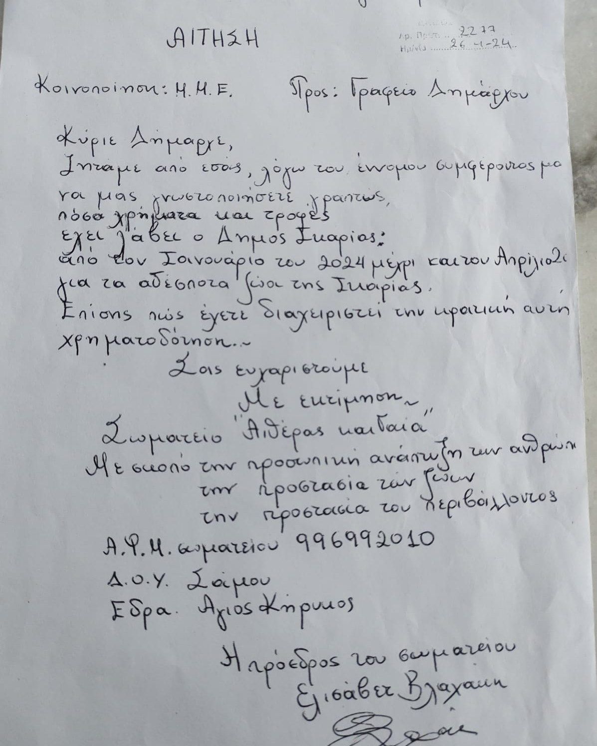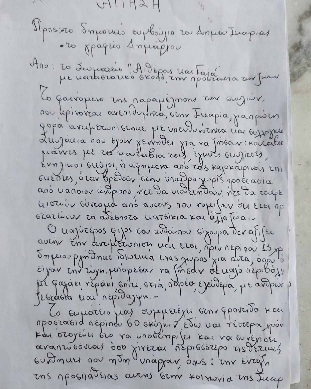 «Μέχρι τώρα κάναμε τρεις αιτήσεις προς τον Δήμο Ικαρίας. Αν και υπάρχουν επείγουσες ανάγκες προς τα ζώα που φροντίζει το σωματείο μας και αναφέρονται στην αίτηση με αριθμό πρωτοκόλλου 2113 που αφορούν κίνδυνο υγείας και μετάδοση θανατηφόρου ασθένειας δεν πήραμε καμία απάντηση εκτός από αδιαφορία. Και μετά από προσωπική επαφή και συζήτηση ξεκάθαρη άρνηση.