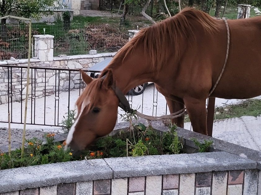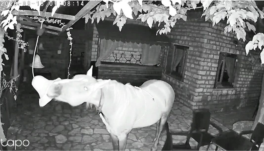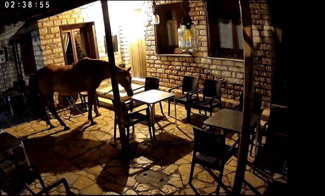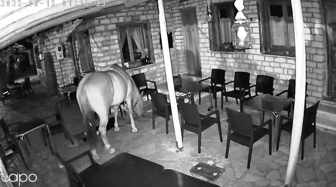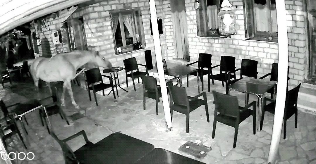 Επίσης απόψε 3 τα μεσάνυχτα επισκέφτηκε το κατάστημα του χωριού που ζει αυτό το άλογο, αλλα και τυχαίνει να το έχουμε εμείς σε ορεινό χωριό της Ναυπακτίας (ΠΟΚΙΣΤΑ) δεν έκανε καμία ζημιά ήταν Κύριος... αυτό που θέλουμε όμως να σας επισημάνουμε είναι οτι παρατηρήθηκε όπως και στο παρελθόν σε αλλα βιντεάκια οπου σας επισυνάπτω και τα παλαιότερα βίντεο παρακάτω που έχουμε στην κατοχή μας οτι έγλυψε παντού στα τραπέζια, κάτω, τις καρέκλες, γιατί ίσως είχε υπολείμματα φαγητών και ΠΕΙΝΑΕΙ αλλά και ΔΙΨΑΕΙ. Δυστυχώς ειναι λυπηρό βοηθήστε μας να το σώσουμε έχουμε απευθυνθεί σε υπηρεσίες και όταν το κάνουμε αυτό το μαζεύει και το δένει...αλλά έπειτα απο λίγες μέρες πάλι τα ίδια…».
