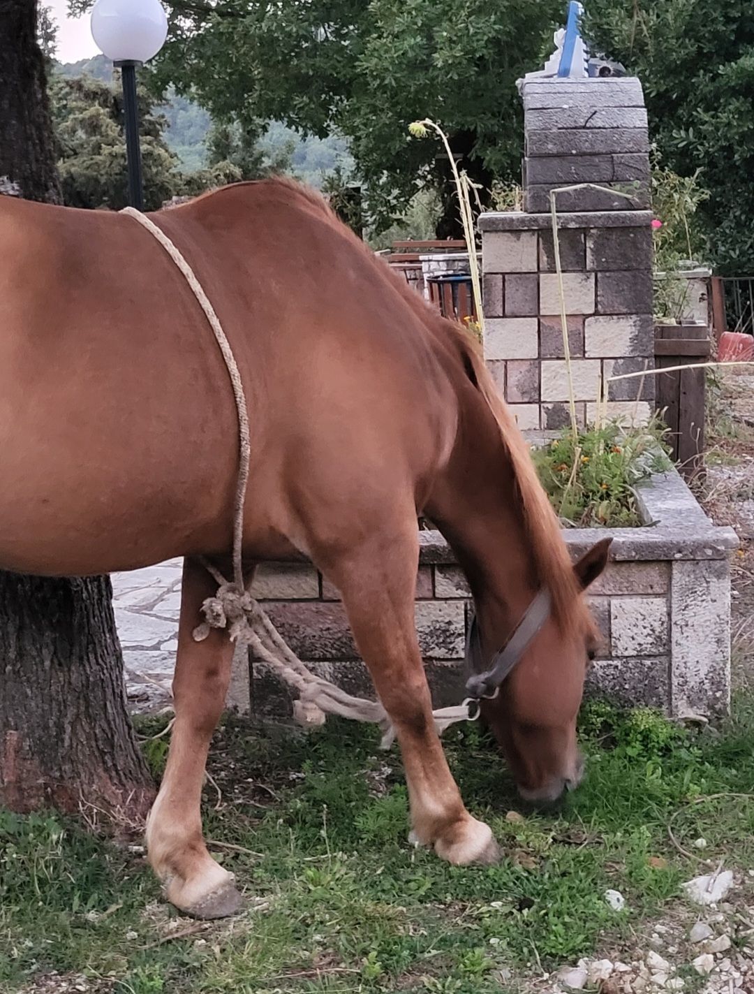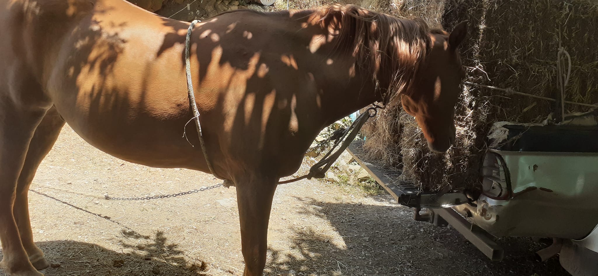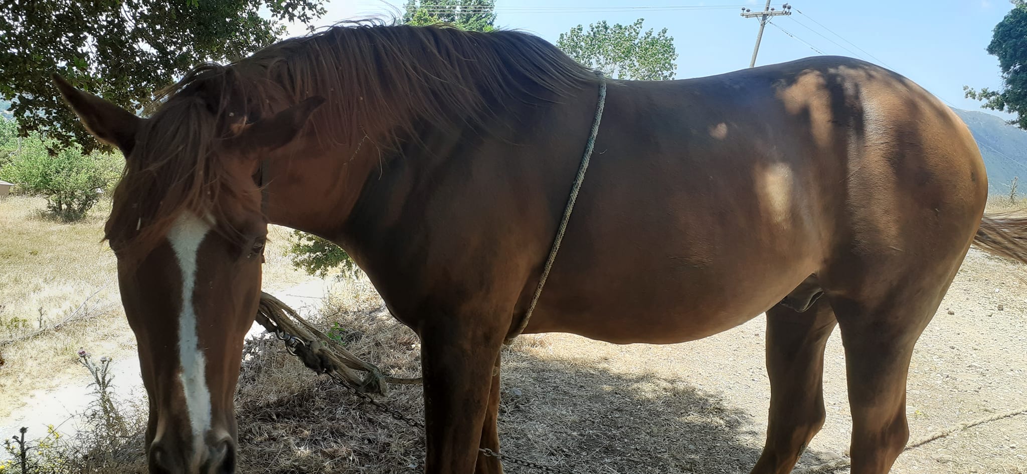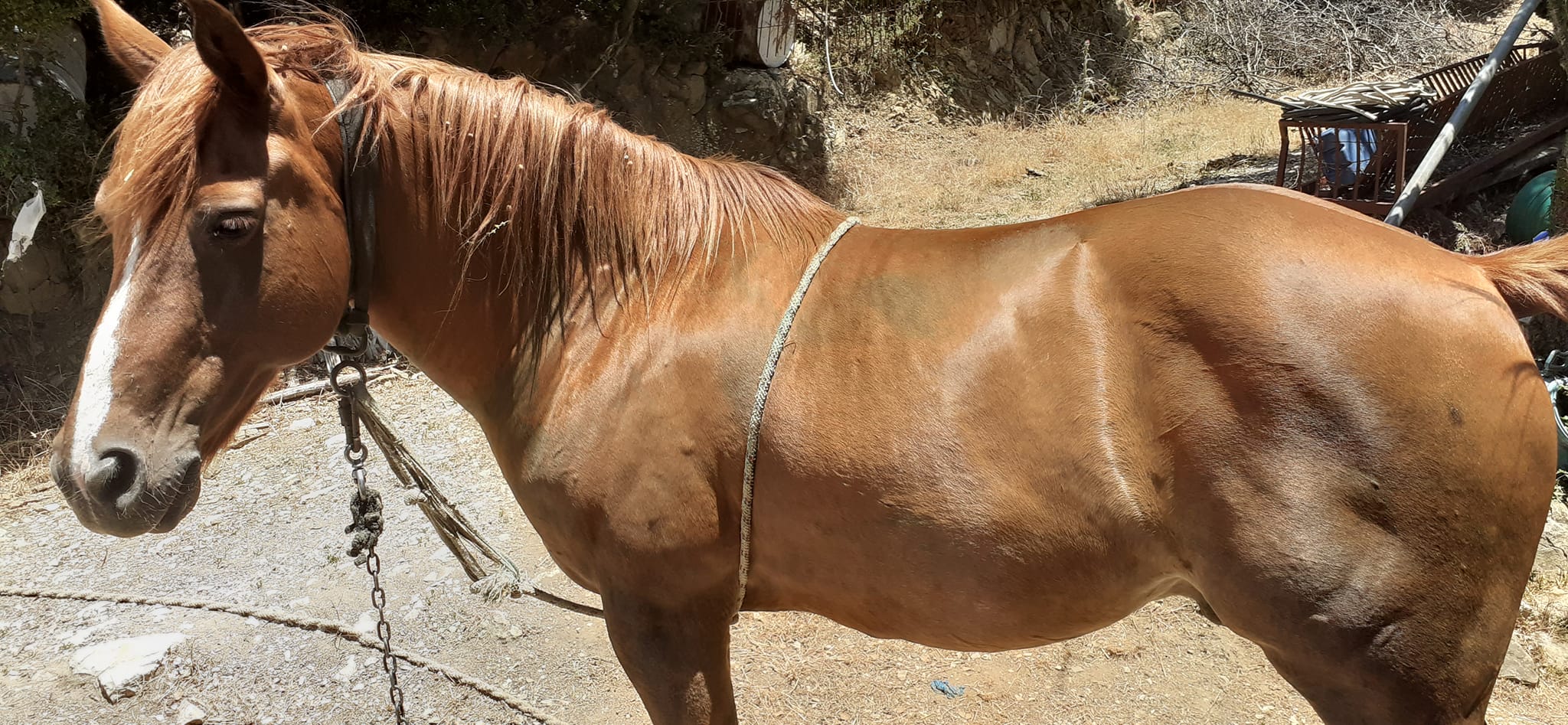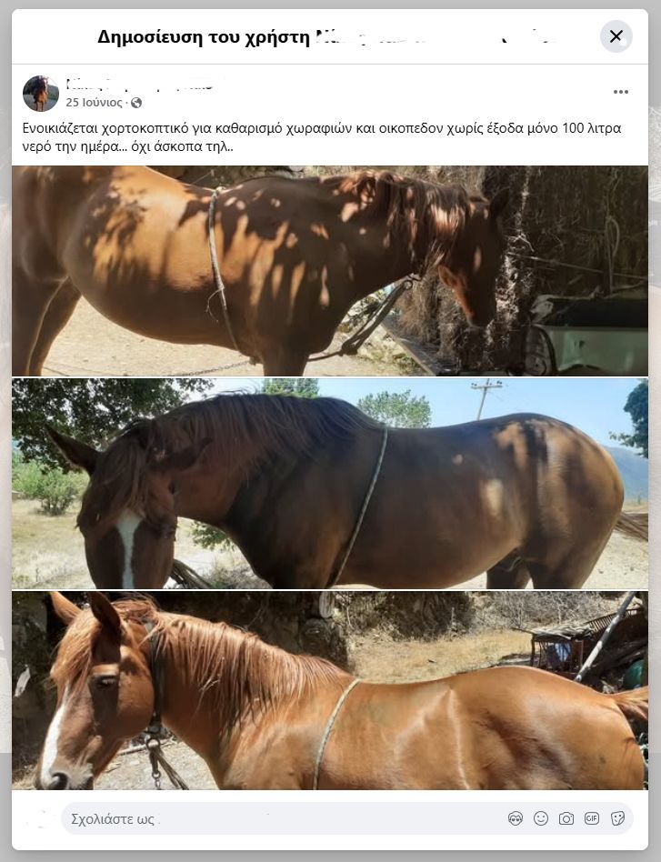 Και πράγματι το έκανε και περιέγραψε στην καταγγελία της με τα εξής λόγια τι υφίσταται το ζώο: «Καλημέρα σας, το πανέμορφο αυτό ζωάκι που σας έχω στείλει στο βίντεο, είναι ένα άλογο πραγματικά παρατημένο στο έλεος για να βρίσκει μόνο του τροφή και όχι μόνο αυτό, το αφεντικό του, ΤΟΥ ΕΧΕΙ ΔΕΣΕΙ όπως διακρίνεται κι εσείς ένα χοντρό σχοινί (τριχιά) στην κοιλιά για να ΜΗΝ ΜΠΟΡΕΙ να σηκώνει το κεφάλι του ψηλά να τρώει μουριές και άλλα δέντρα και κάνει ζημιές σε περιβόλια και του κάνουν αυτουνού παρατηρήσεις... με αποτέλεσμα να έχει κάνει εκδορές το σώμα του απο το σχοινί.