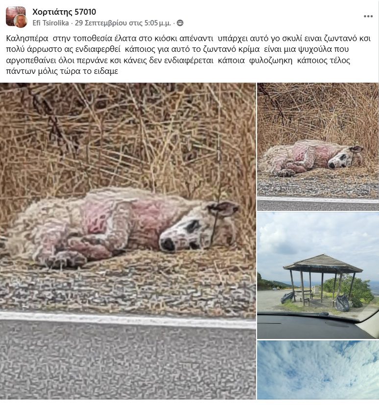 «Καλησπέρα στην τοποθεσία έλατα στο κιόσκι απέναντι υπάρχει αυτό γο σκυλί ειναι ζωντανό κσι πολύ άρρωστο ας ενδιαφερθεί κάποιος για αυτό το ζωντανό κρίμα είναι μια ψυχούλα που αργοπεθαίνει όλοι περνάνε κσι κάνεις δεν ενδιαφέρεται κάποια φυλοζωηκη κάποιος τέλος πάντων μόλις τώρα το ειδαμε».